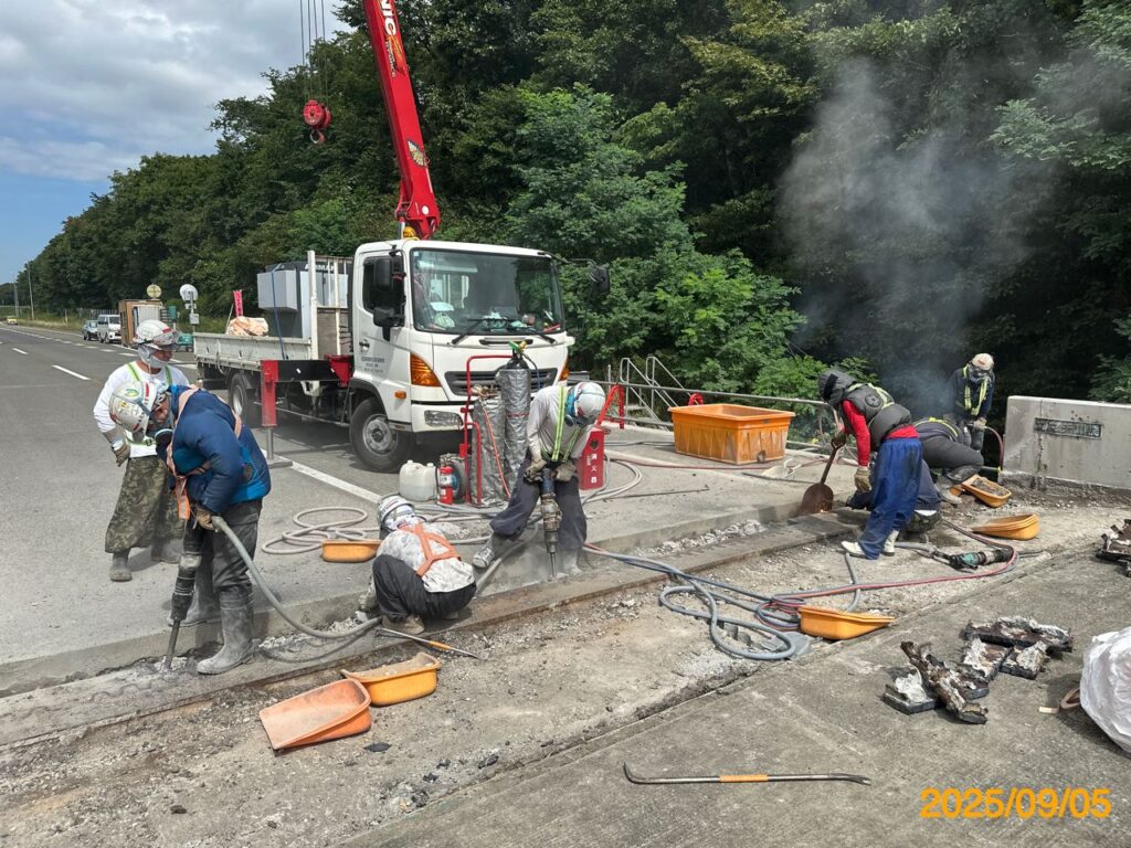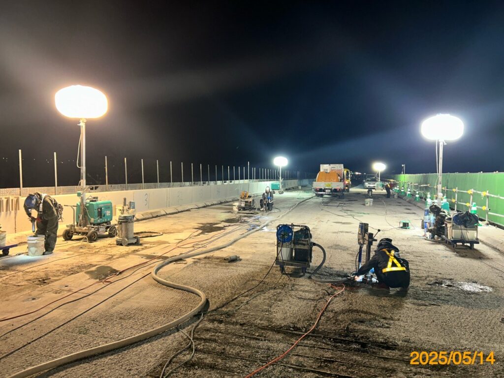 落橋防止、橋脚巻立て、あと施工アンカー、耐震スリット、 無収縮モルタル注入等の施工、鉄筋探査・引張試験。
